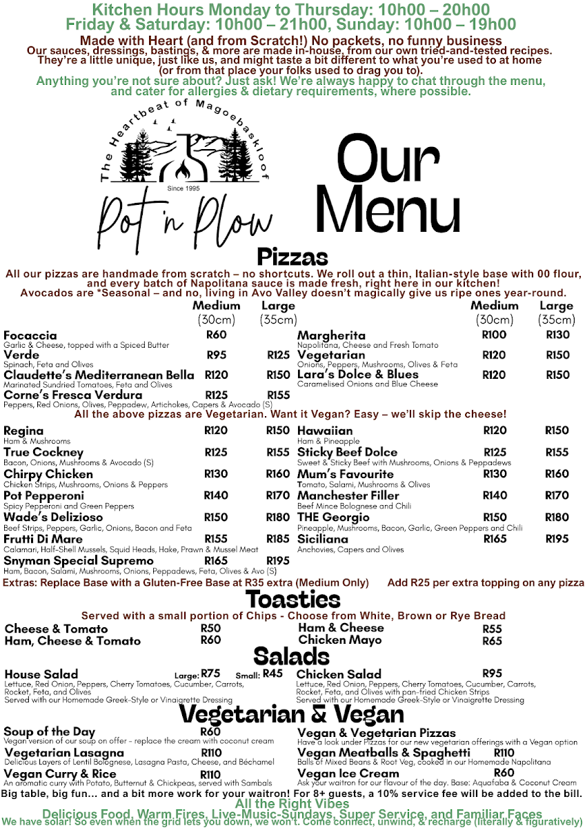 Welcome to Pot 'n Plow, a delightful family restaurant and pub tucked away in the scenic Magoebaskloof region of South Africa. This eatery offers a unique atmosphere, with the charm of mist rolling in and out as quickly as the sun shines. Its menu features an array of delectable dishes, with a highlight being their renowned pizzas. Customers rave about the thin crust topped with fresh ingredients, resulting in a delightful culinary experience.